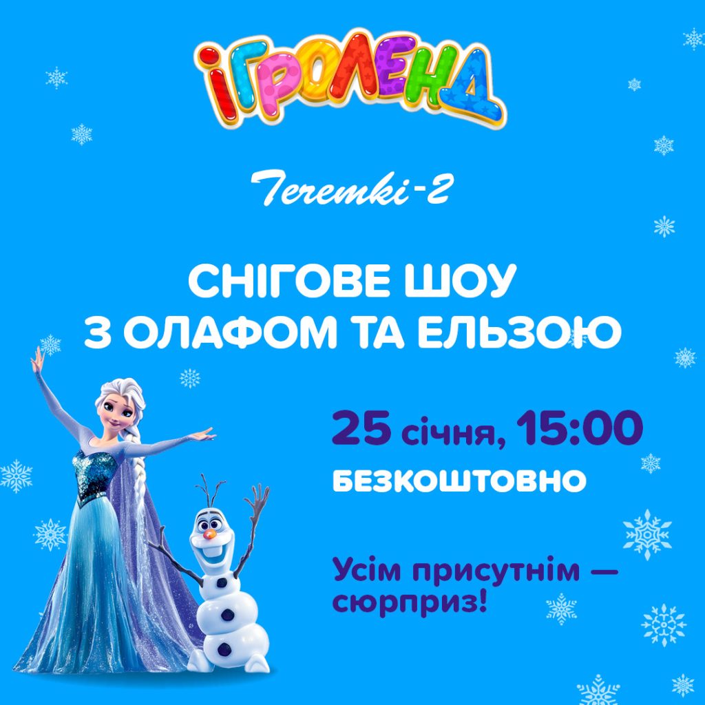 25 января в 15:00 в Игроленд Теремки-2 состоится снежное шоу с Олафом и Эльзой. Детей ждет праздничная развлекательная программа с интерактивными играми, танцами, конкурсами и сказочной атмосферой в стиле любимого мультфильма.
