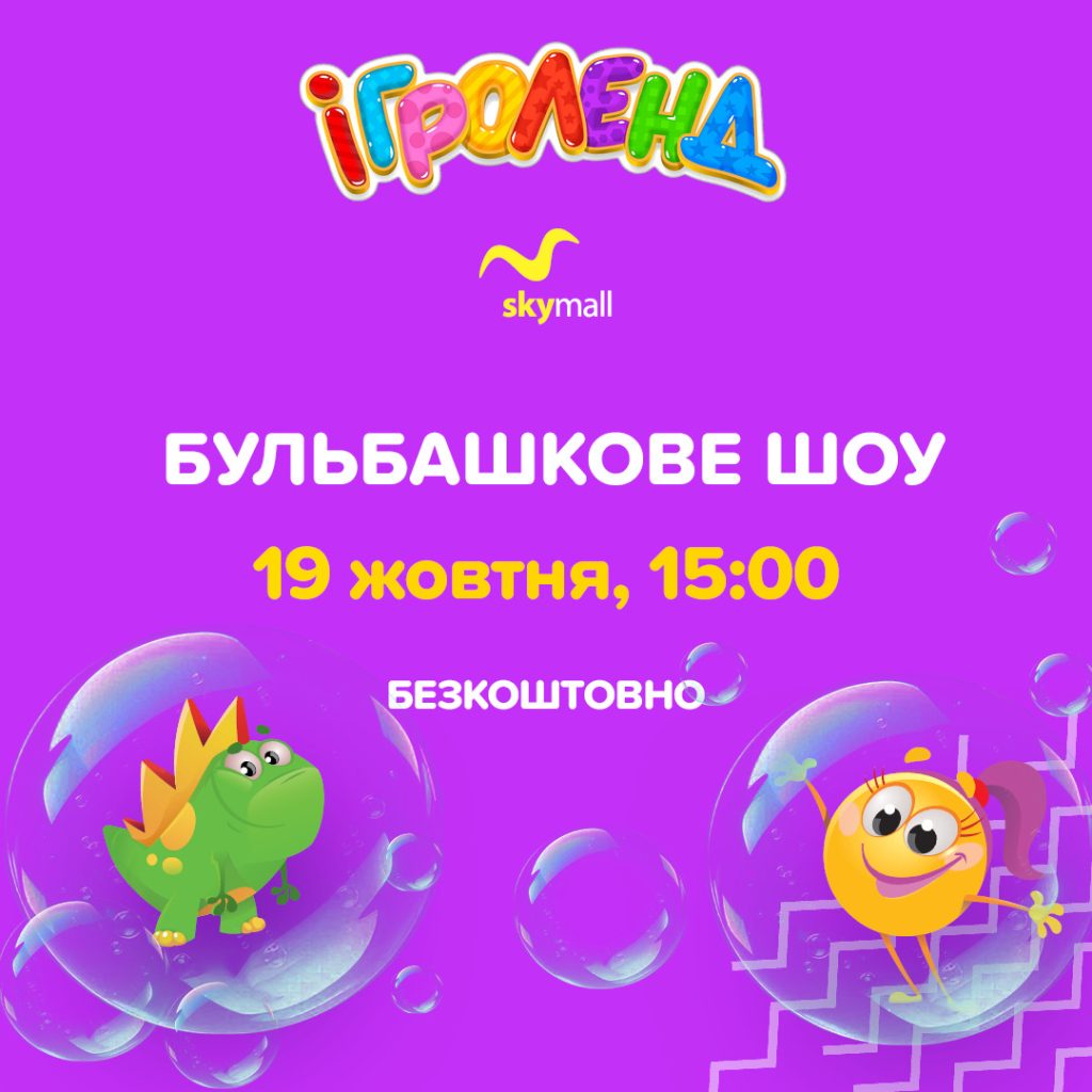 19 жовтня о 15:00 запрошуємо всіх маленьких і дорослих гостей до Ігроленд у ТРЦ Sky Mall на яскраву подію — Бульбашкове шоу!