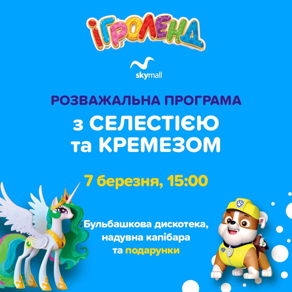 7 березня о 15:00 дитячий розважальний центр Ігроленд у Sky Mall запрошує дітей та батьків на святкову розважальну програму з принцесою Селестією та Кремезом.