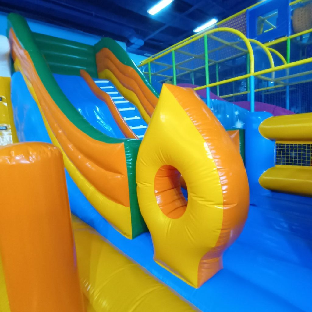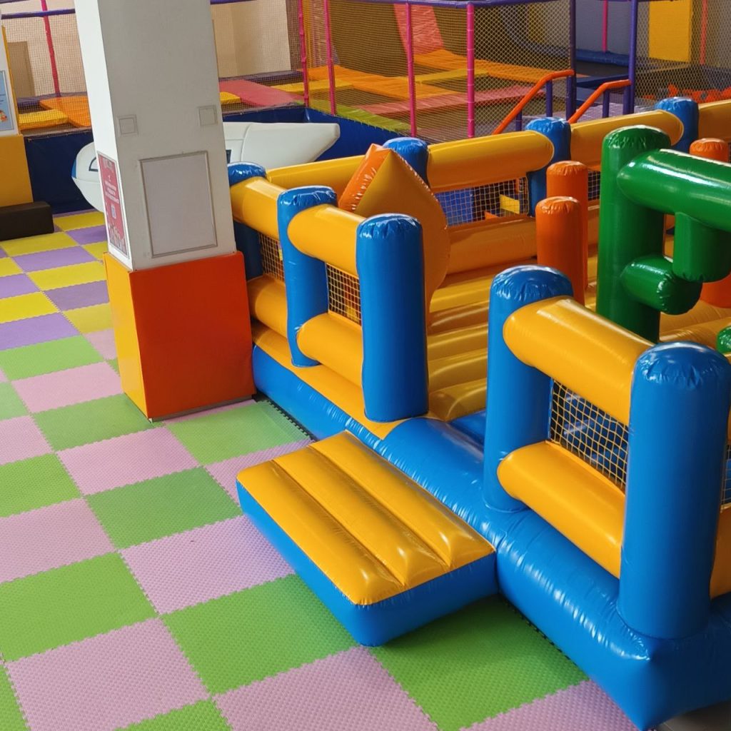 Величезна територія необмежених розваг: натяжні батути, надувне містечко, великий Лабіринт з гірками та повітряними гарматами, карусель, іграшки, толокари, конструктор.