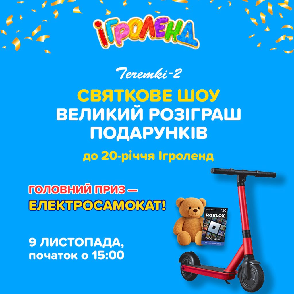 Ігроленд святкує 20 років і запрошує тебе 9 листопада до ТЦ “Теремки-2” на неймовірне свято розваг і подарунків! Святкову програму відкриє яскраве WOW-шоу о 15:00 — море емоцій, сюрпризів та веселощів гарантовано! А після цього на всіх гостей чекає великий розіграш цінних призів!
